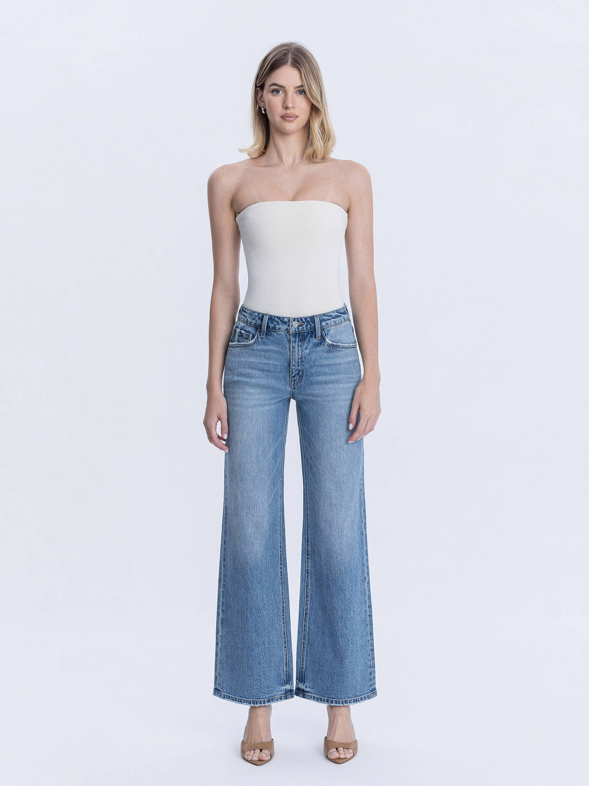 These medium wash jeans feature a high-rise waist and a wide leg silhouette for a flattering fit. Crafted from comfortable stretch denim, they offer full-length coverage with a finished hem and include five functional pockets for practicality.