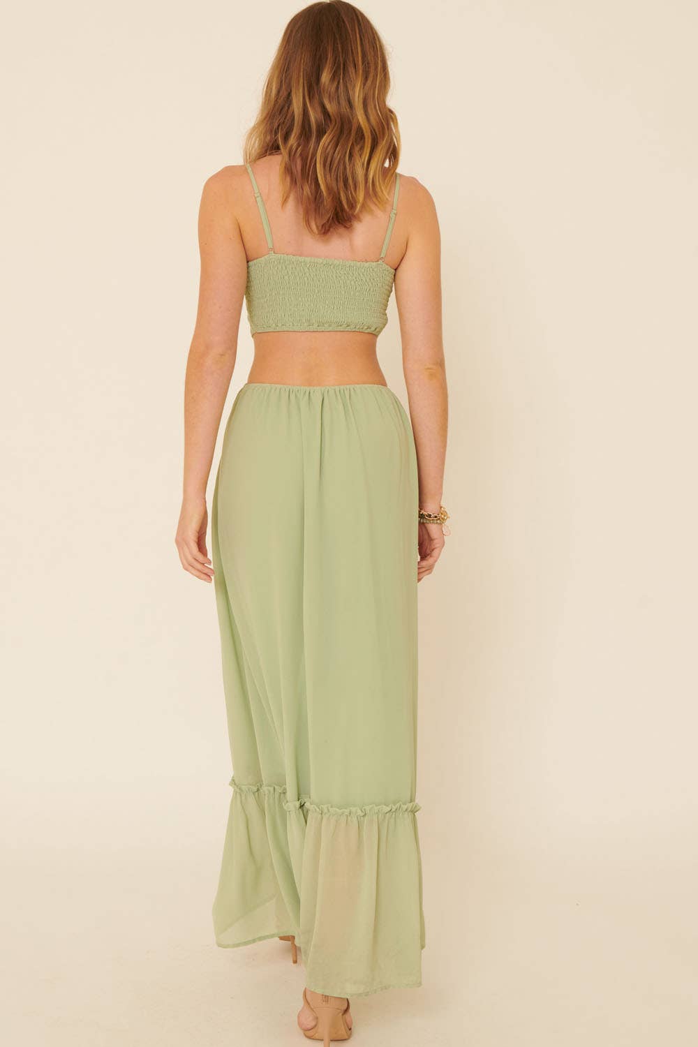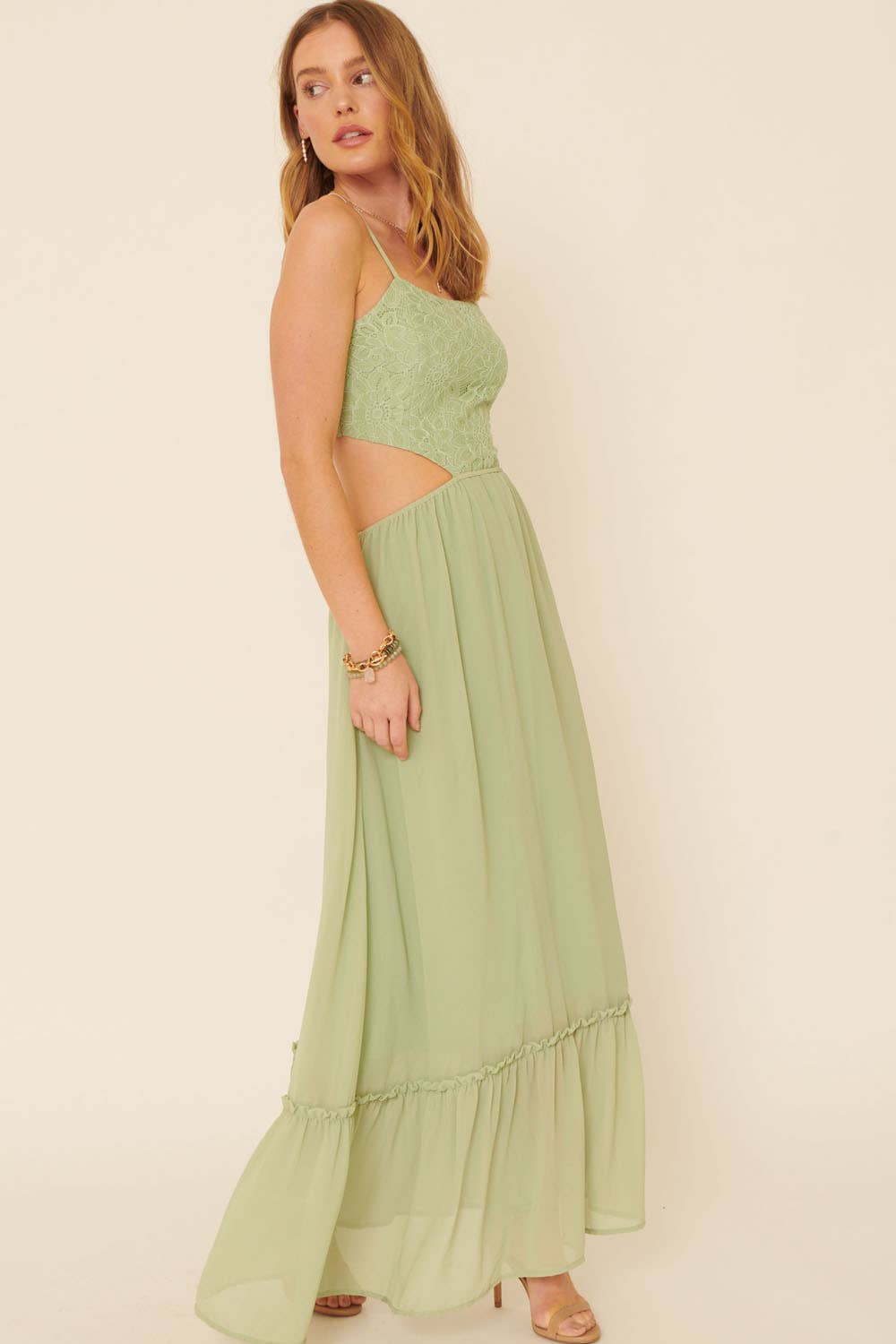 A sheer, chiffon floral lace maxi dress with the following features: Straight neckline. Adjustable cami straps. Sleeveless. Lining. Side cutouts. Ruffle trim skirt. Low smocked back. Relaxed fit.