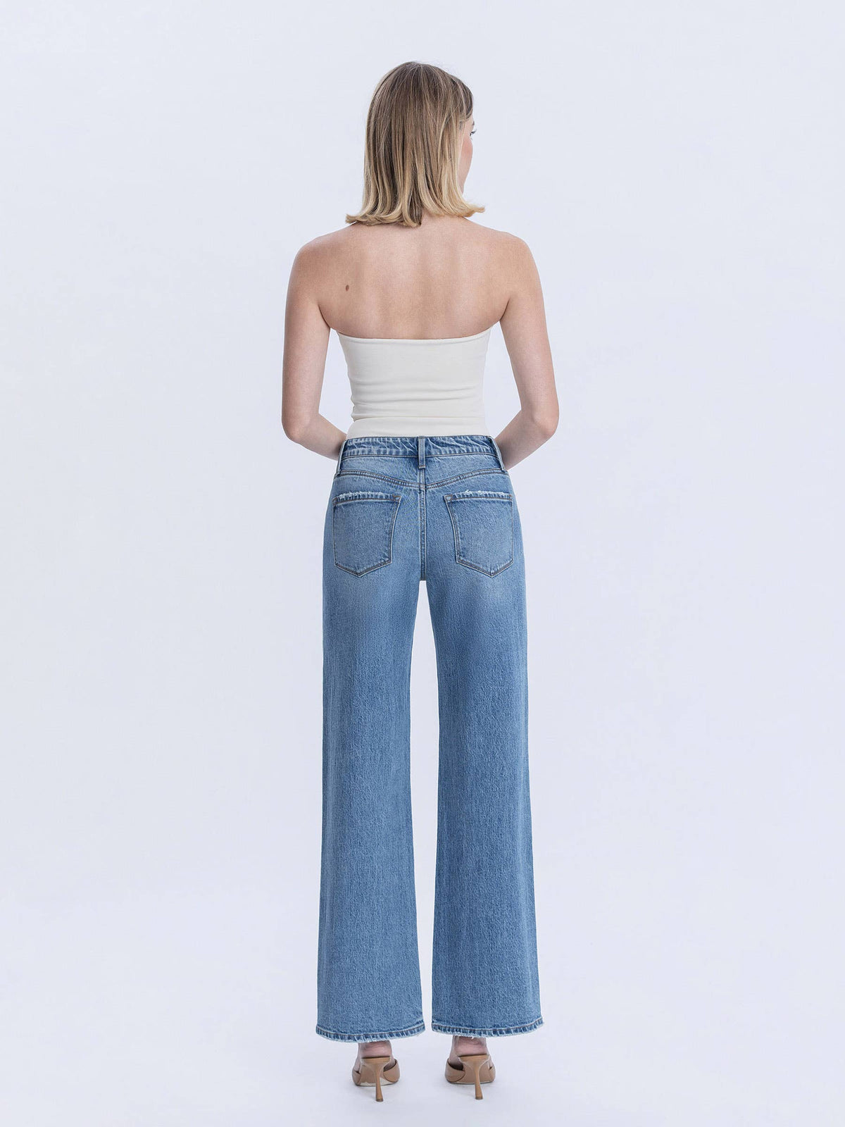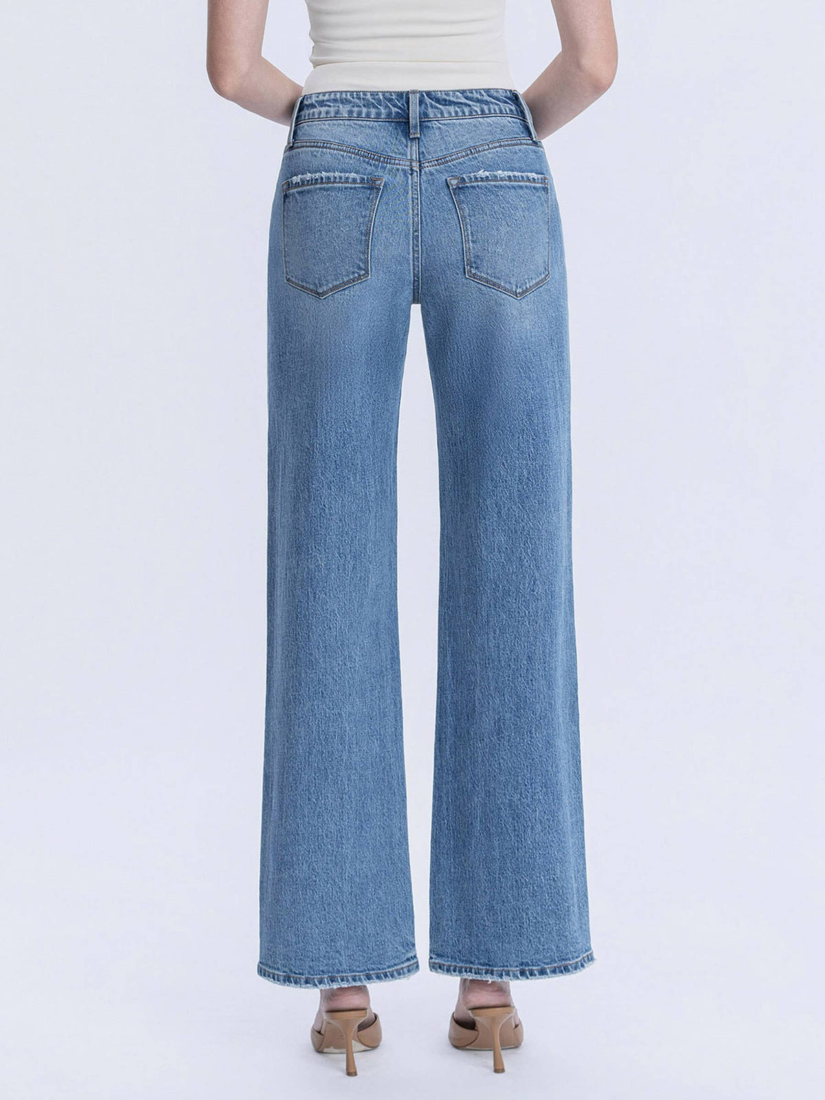These medium wash jeans feature a high-rise waist and a wide leg silhouette for a flattering fit. Crafted from comfortable stretch denim, they offer full-length coverage with a finished hem and include five functional pockets for practicality.