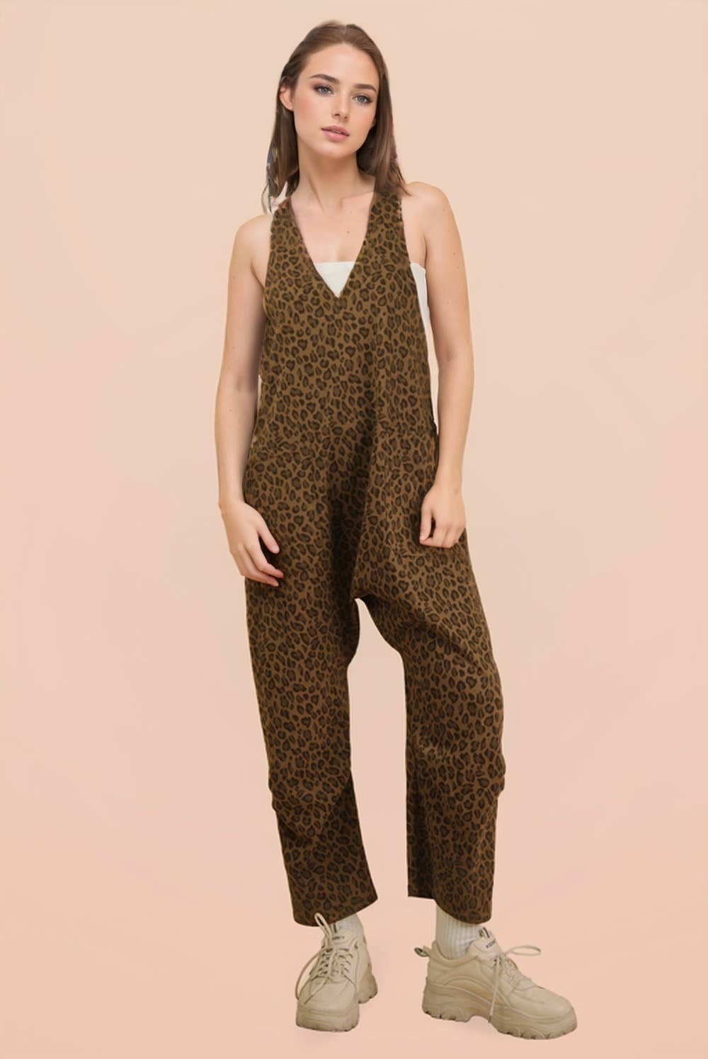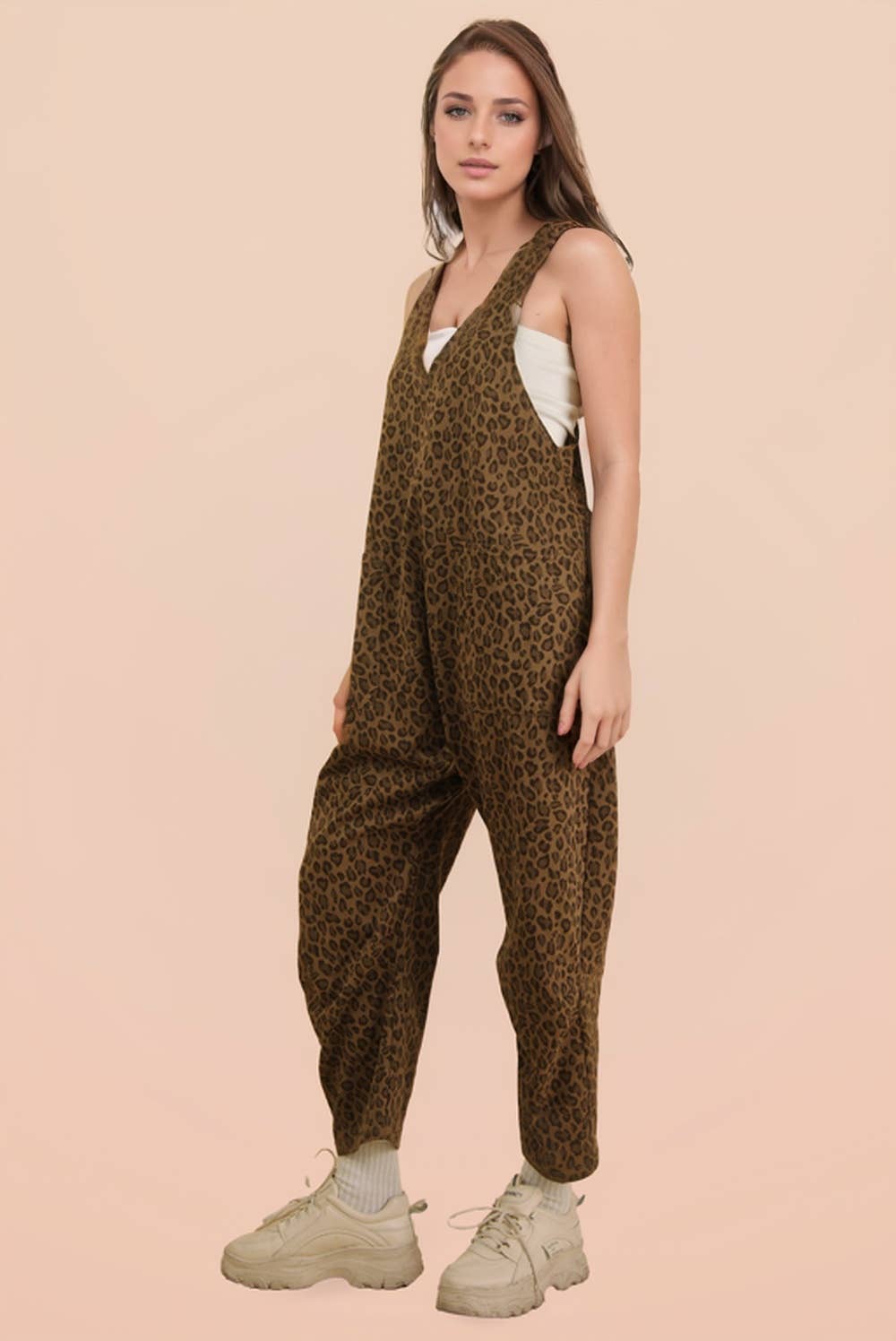 Effortlessly chic, this sleeveless jumpsuit features a striking leopard print and relaxed silhouette designed for all-day comfort. The deep V-neckline creates a flattering focal point, while raw edge detailing adds contemporary edge. Functional side pockets provide practical storage, making this versatile piece perfect for casual outings or layered styling.