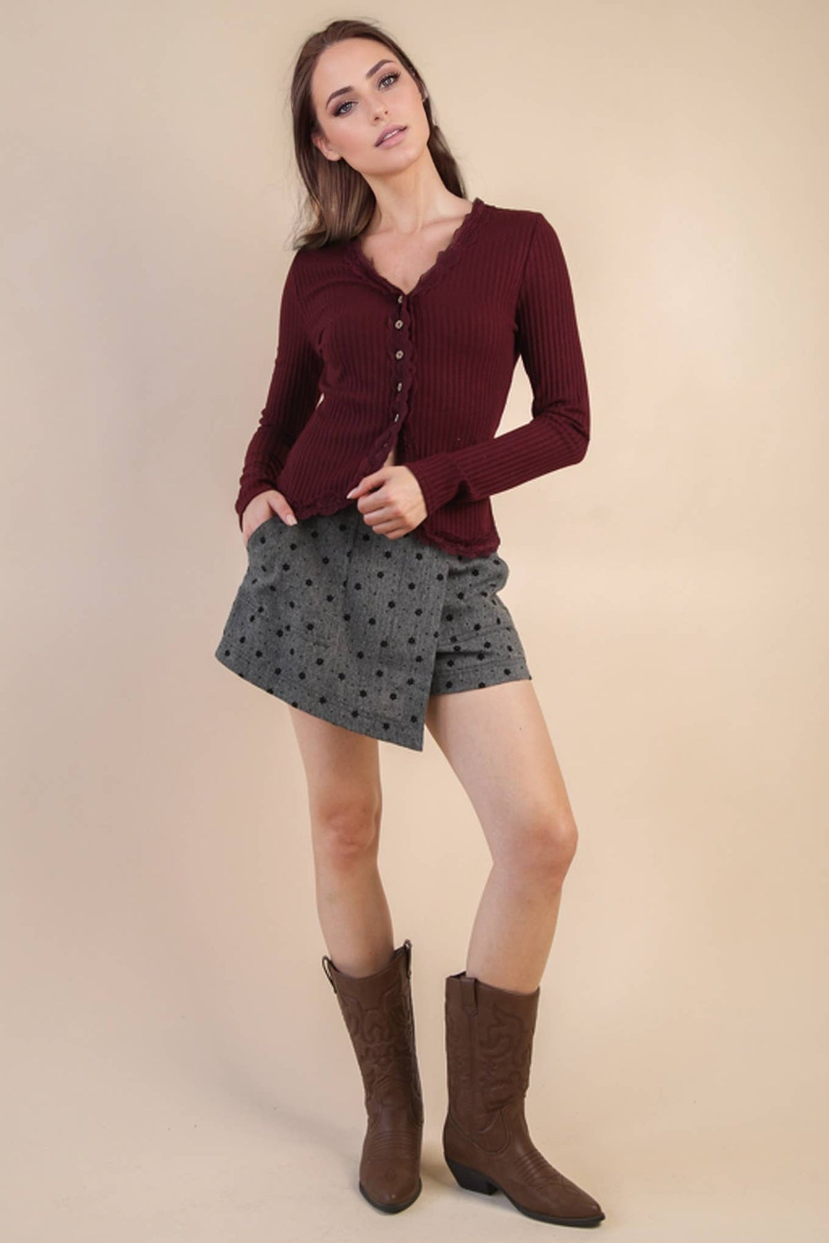 Crafted with precision tailoring, this fitted knit top features a sophisticated deep V-neckline and extended sleeves for refined elegance. Delicate lace trim detailing elevates the design, while the button-down front offers versatile styling options. The structured knit fabric provides a polished silhouette suitable for both professional and casual occasions.