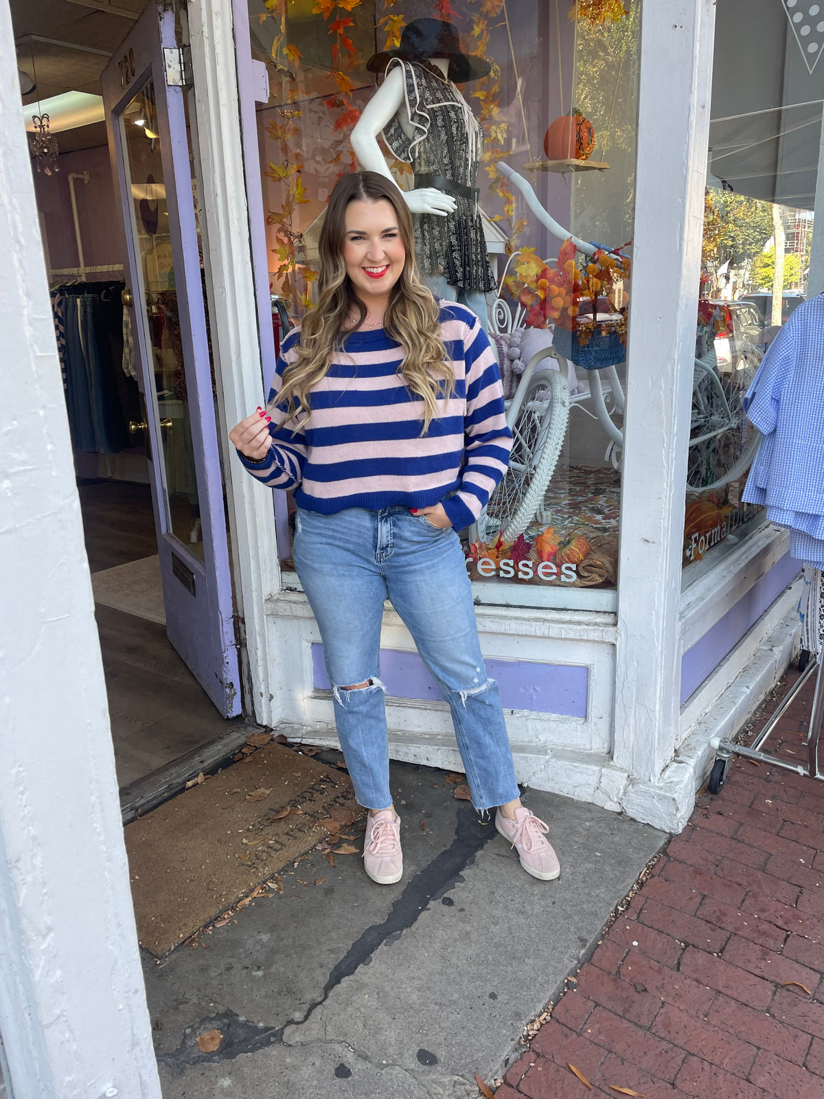 Embrace effortless style with this relaxed fit sweater, featuring a bold striped pattern. Ideal for versatile layering, this piece infuses comfort with its relaxed silhouette. A perfect pick for casual outings or lounging on cooler days. Pair with high-waisted jeans and ankle boots for a timeless look.