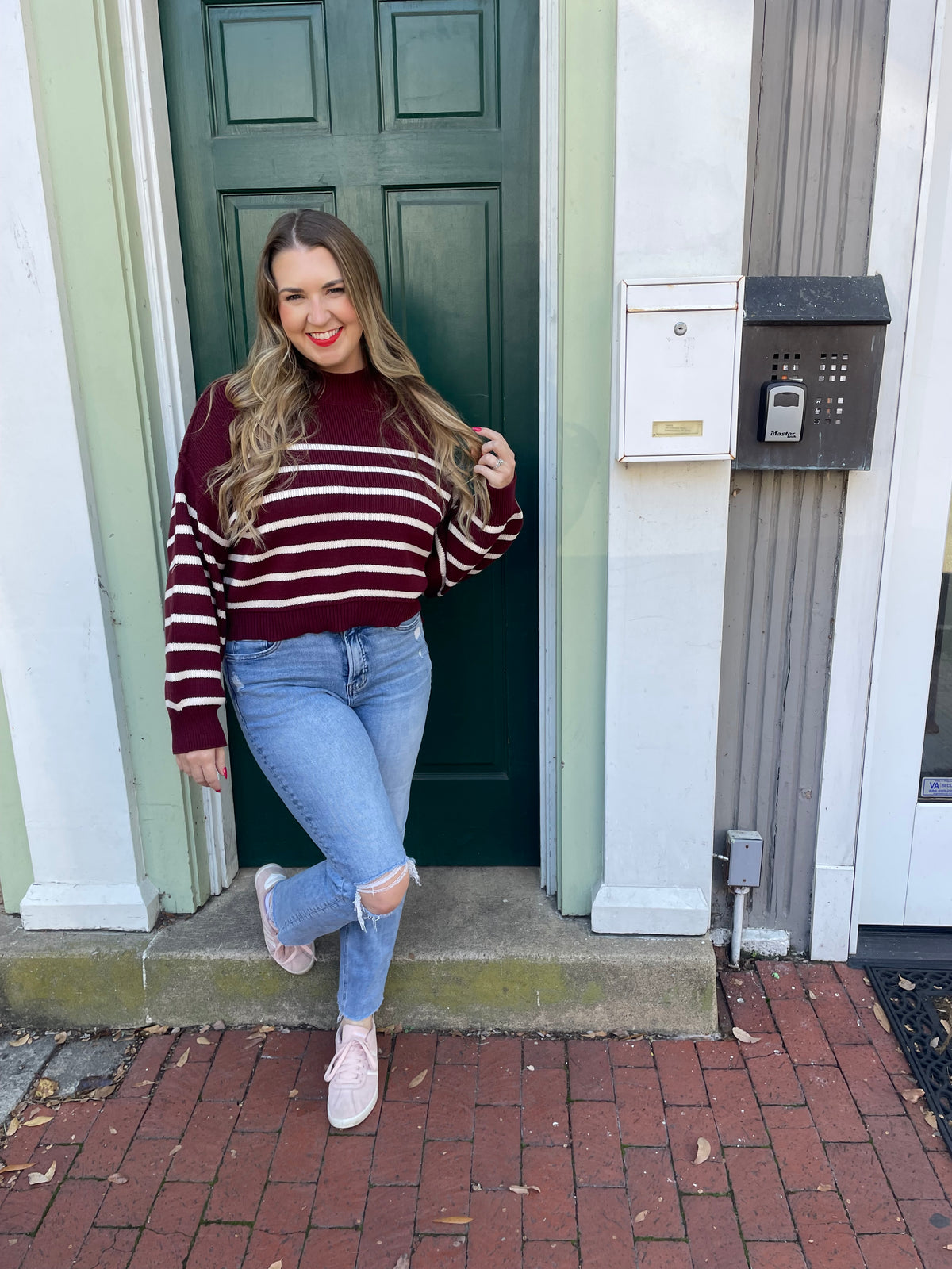 This knit sweater features a mock neckline and long sleeves with a relaxed drop shoulder design. Accented by ribbed trim details and a classic stripe pattern, it is crafted without lining for a lightweight, comfortable fit.