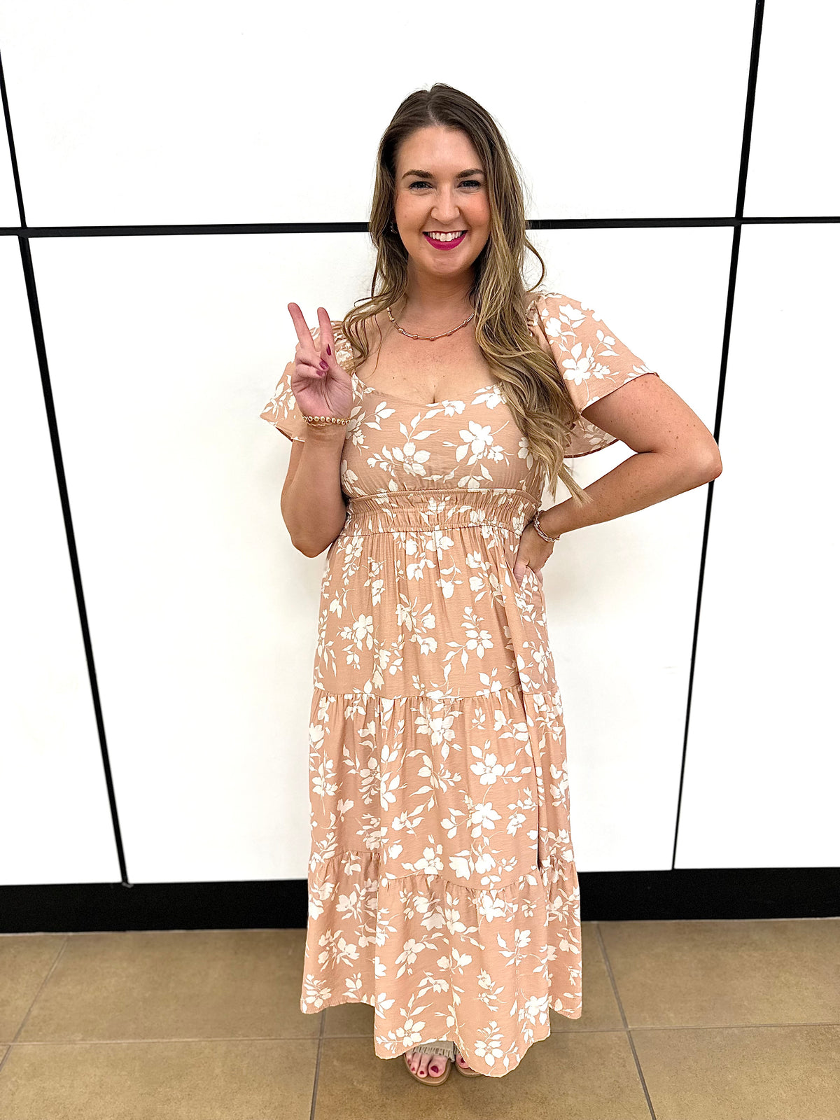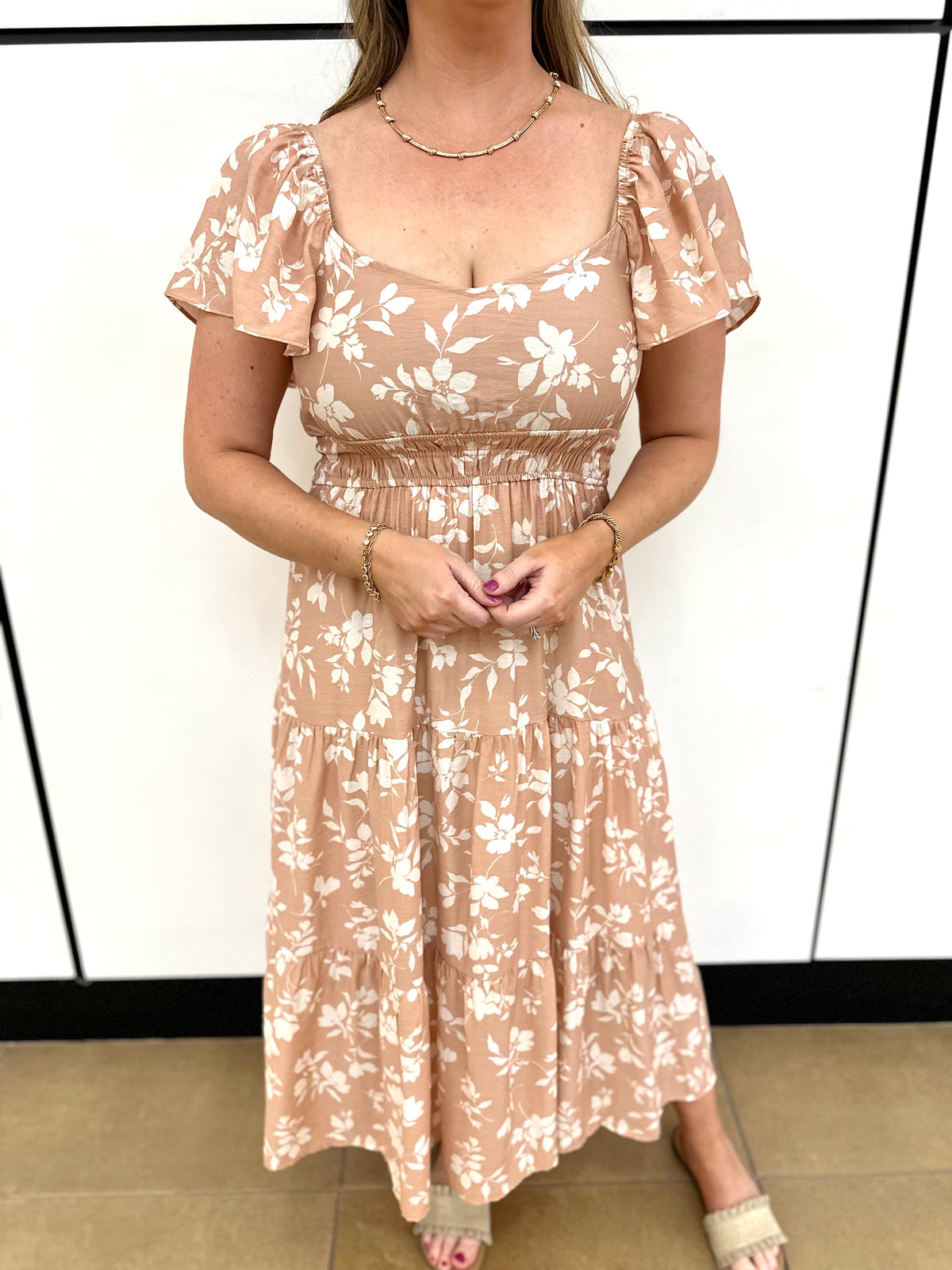 This elegant midi dress features a scoop neckline, short flounce sleeves, a shirred waist, and tiered layers for a chic and feminine look. The dress is adorned with a delicate floral print and can also be worn as a maxi dress. It is unlined for a lightweight and comfortable fit.