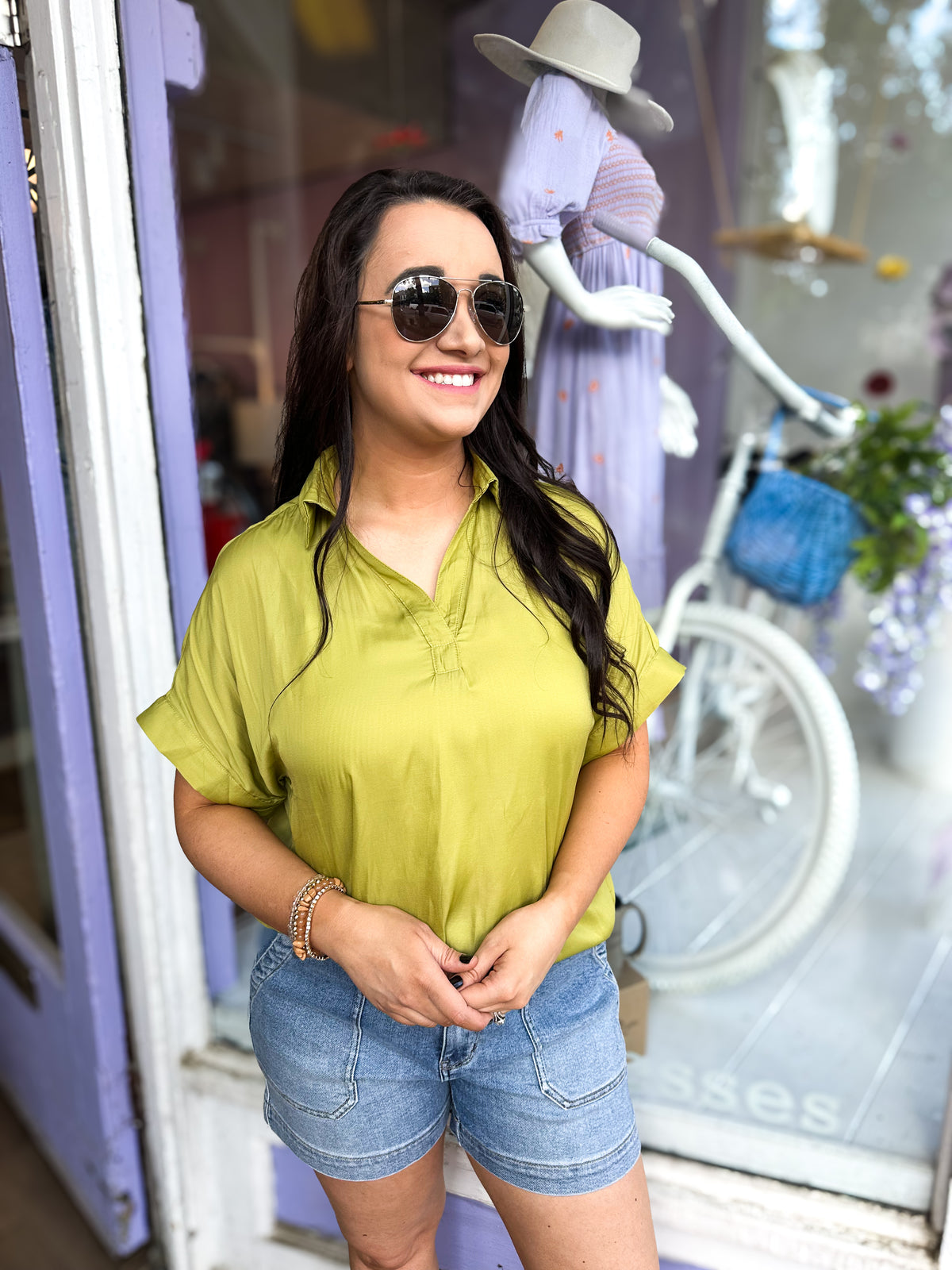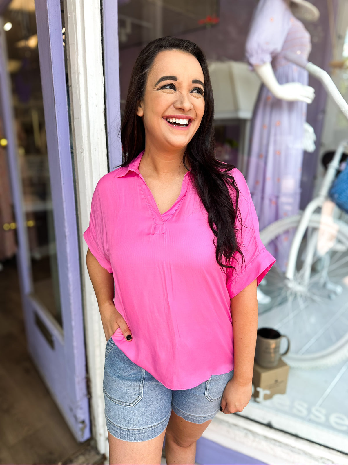 Short sleeve blouse top made in a light weight, airy fabric with a collared + v-neckline.