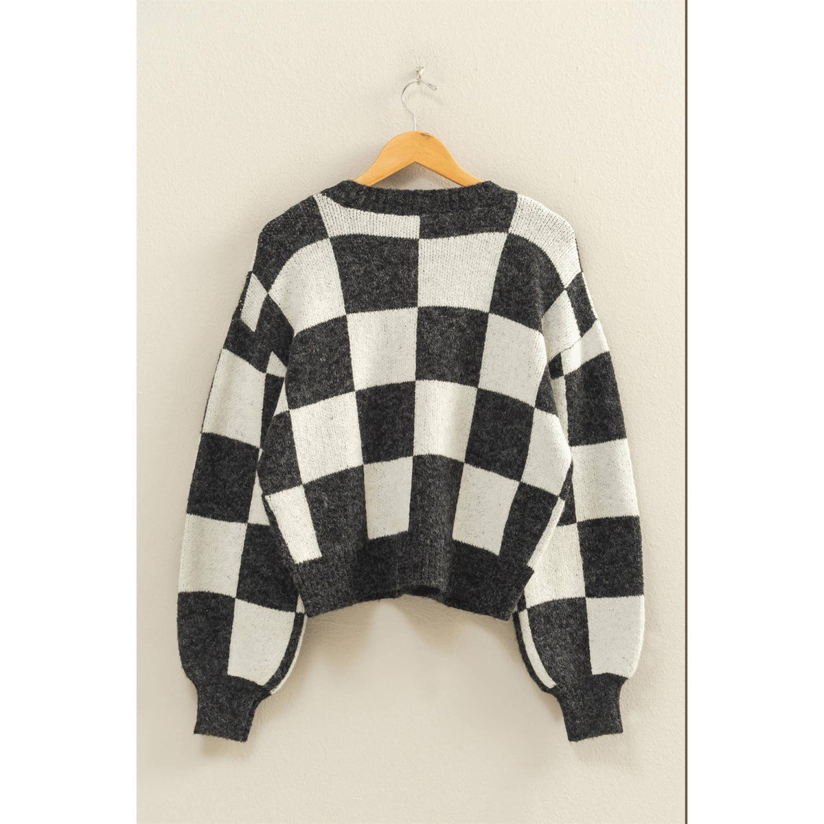 This cozy cardigan sweater features a bold checkered pattern complemented by a relaxed silhouette and chunky button details, perfect for versatile styling. Pair it with slacks for a refined look or denim for casual days. Ideal for transitional weather or layering over your favorite blouse.