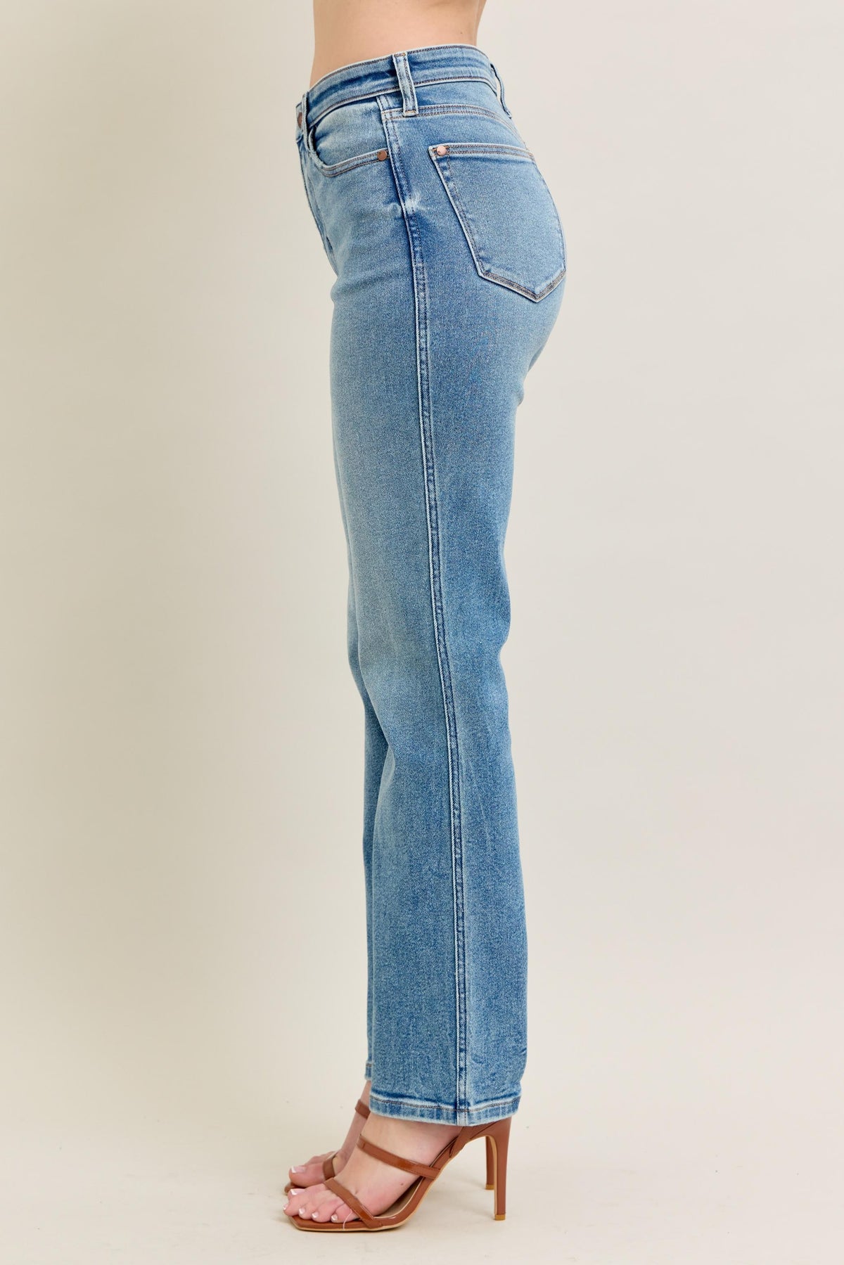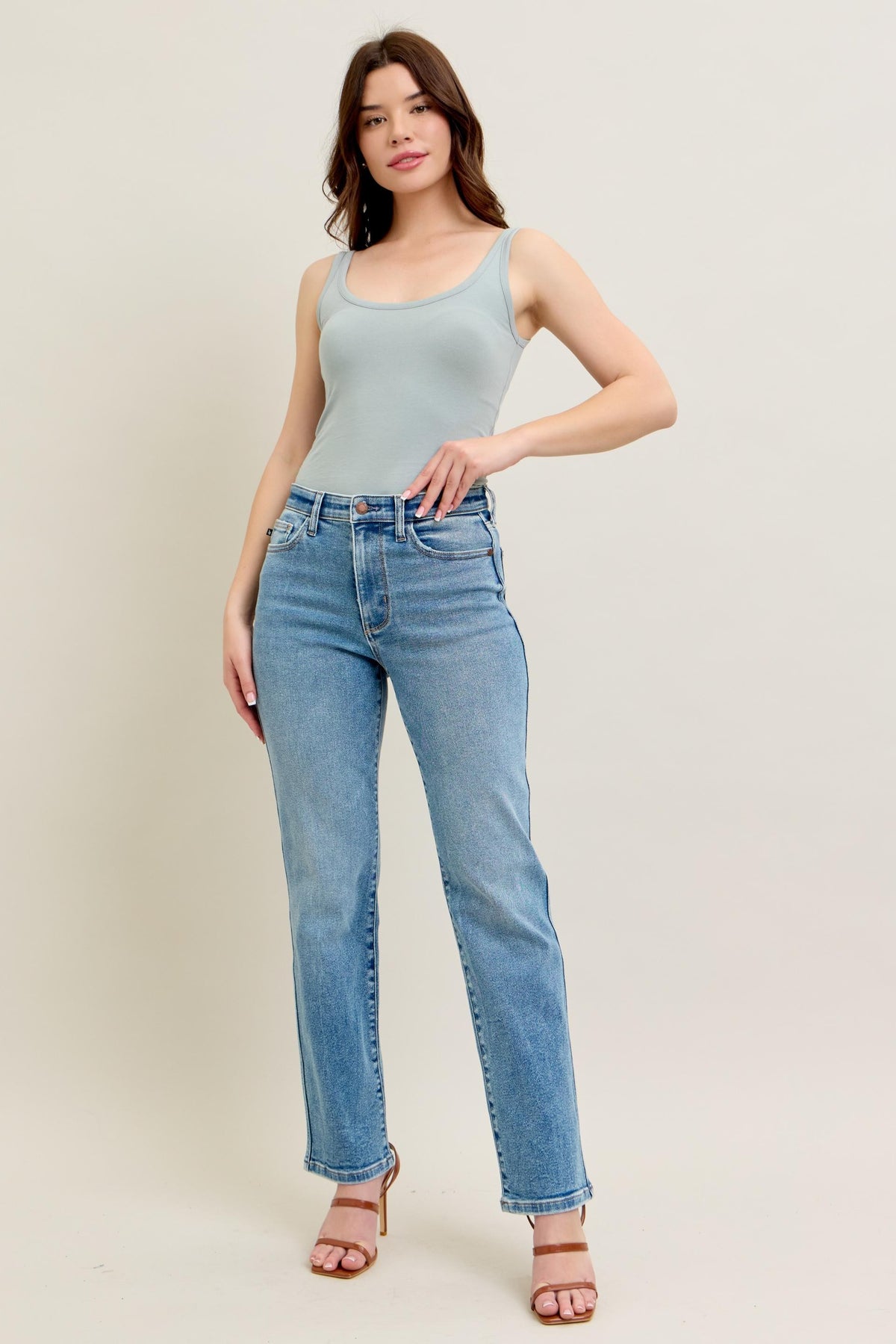 Introducing our new medium wash straight leg denim, designed with the perfect stretch and fit. For the ultimate fit, we recommend sizing down by one size.